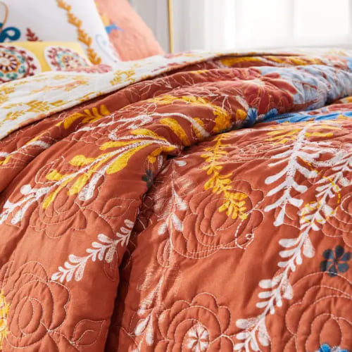While some accent pieces feature embroidery, the majority of the vibrant bohemian and floral patterns are high-quality stencil prints or classic pieced patchwork designs.